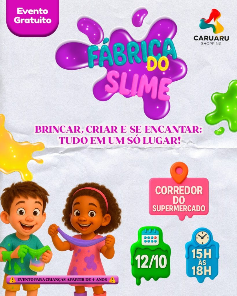 Fábrica do Slime – Diversão no Dia das Crianças No dia 12 de outubro, o Caruaru Shopping realiza a oficina “Fábrica do Slime”, um evento especial que promete encantar as crianças com muita criatividade e diversão. A atividade acontecerá no corredor do supermercado, das 15h às 18h, e será totalmente gratuita. Durante a oficina, os […]