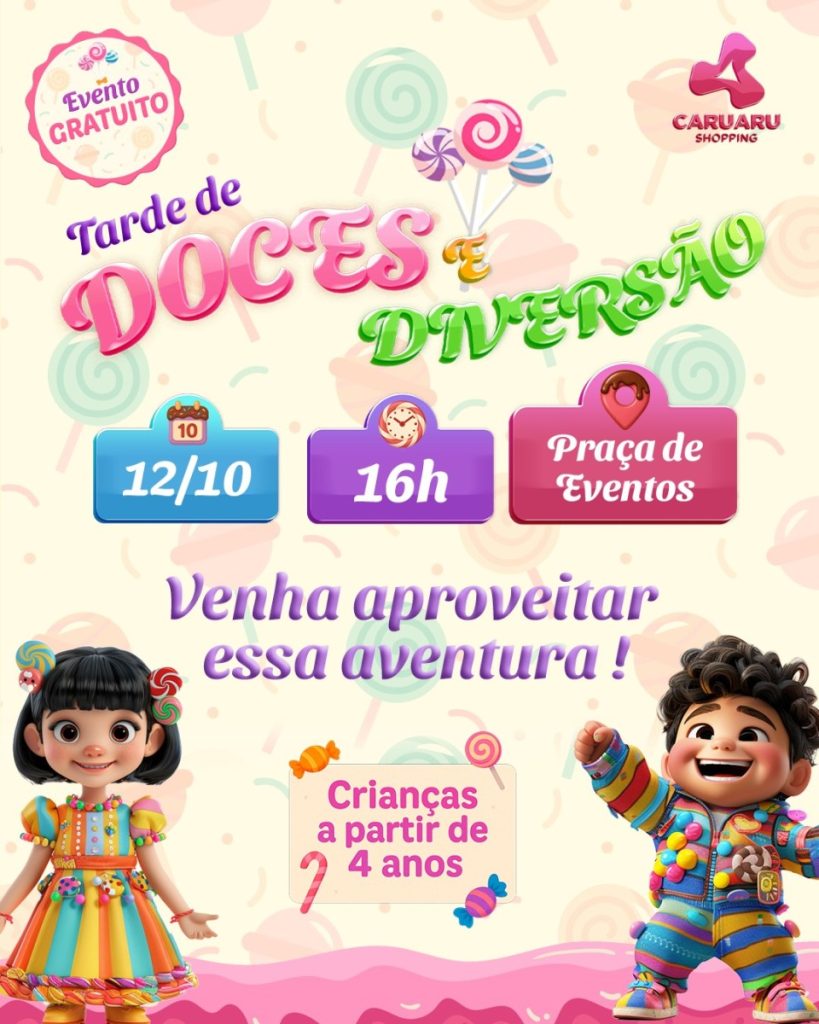 Tarde de Doces e Diversão no Caruaru Shopping No próximo dia 12 de outubro, das 16h às 18h30, o Caruaru Shopping realiza a Tarde de Doces e Diversão, na Nova Praça de Eventos. O espaço será transformado em um verdadeiro universo encantado, onde personagens do mundo dos doces ganham vida para interagir com as crianças […]