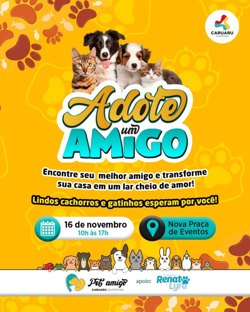 O Caruaru Shopping, em parceria com o Instituto Renato Lyra, promove no dia 16 de novembro a ação “Adote um Amigo”, que acontece das 10h às 17h, na nova Praça de Eventos. O objetivo é incentivar a adoção responsável e oferecer uma nova chance para cães e gatos que aguardam por um lar cheio de […]