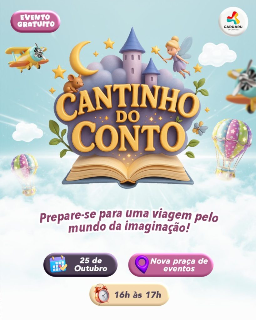 Cantinho do Conto — Contação de Histórias no Caruaru Shopping No dia 25 de outubro de 2025, das 16h às 17h, a Praça de Eventos do Caruaru Shopping recebe o Cantinho do Conto, uma atividade especial de contação de histórias dedicada ao público infantil e às famílias. A ação apresenta narrativas lúdicas e envolventes, com […]