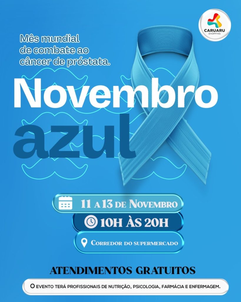 Caruaru Shopping promove programação especial do Novembro Azul Entre os dias 11, 12 e 13 de novembro, o Caruaru Shopping realiza uma programação especial em alusão ao Novembro Azul, campanha dedicada à conscientização sobre a saúde do homem e à prevenção do câncer de próstata. O evento acontecerá no corredor do Supermercado, das 10h às […]