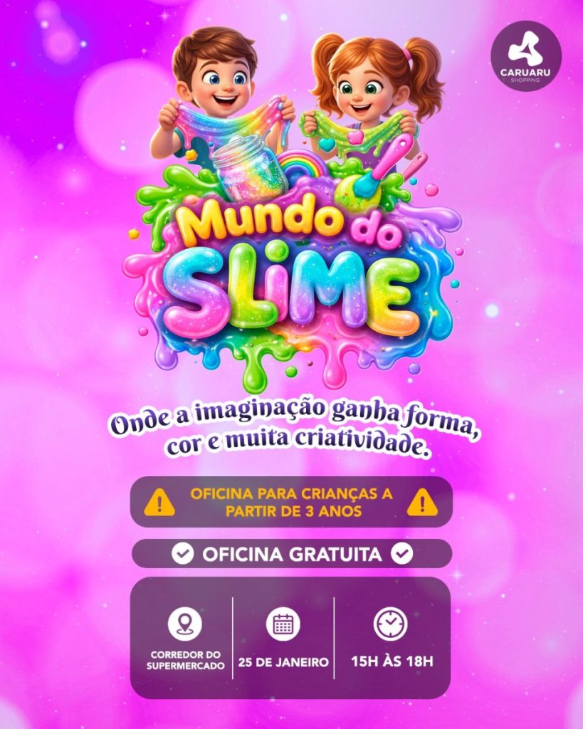 O Caruaru Shopping promove o evento Mundo do Slime, uma atividade lúdica voltada ao público infantil, que estimula a criatividade e proporciona momentos de diversão. 📅 Data: 25 de janeiro⏰ Horário: das 15h às 18h📍 Local: Corredor do Supermercado A ação integra a programação de lazer do shopping, oferecendo experiências pensadas para toda a família.