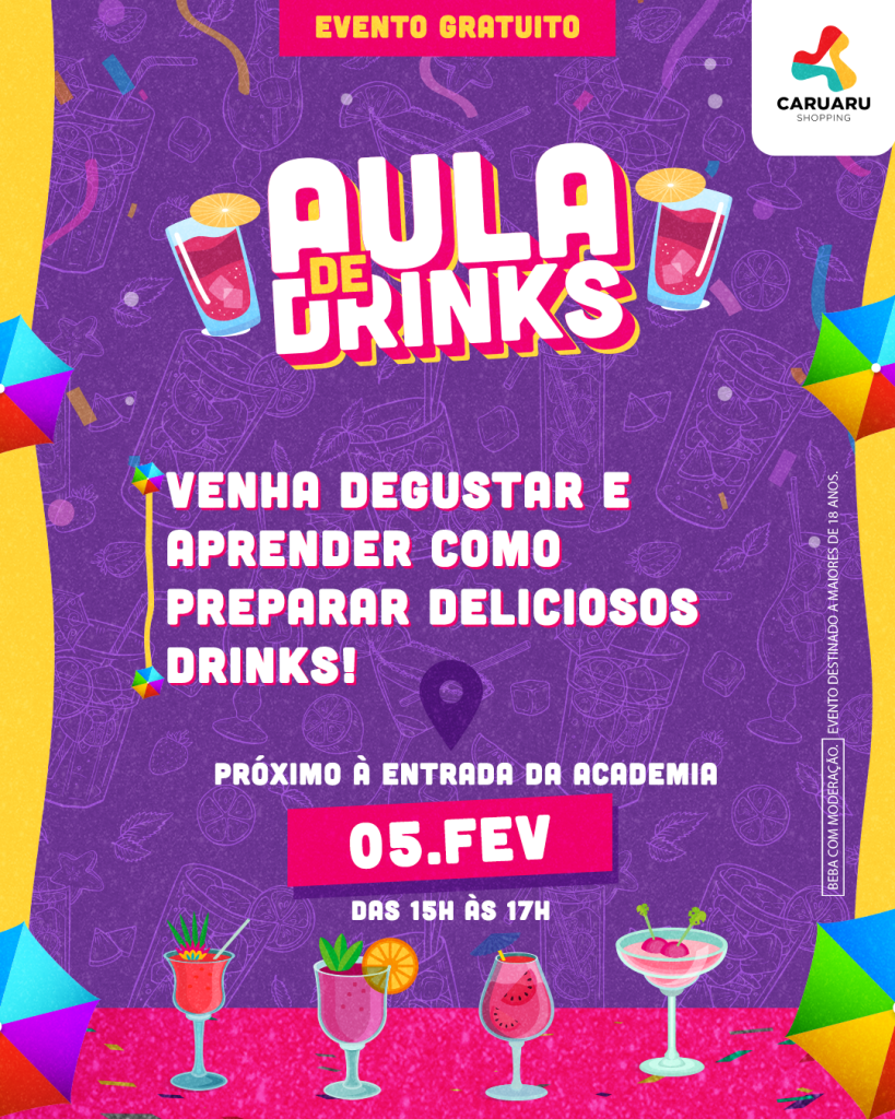 Caruaru Shopping realiza Aula de Drinks O Caruaru Shopping realizará, no dia 5 de fevereiro, uma Aula de Drinks, como parte da programação do Carnaval do centro de compras e convivência. O evento acontecerá das 15h às 17h, próximo à academia e será ministrado por um bartender. De acordo com a gerente de Eventos, Cleide […]