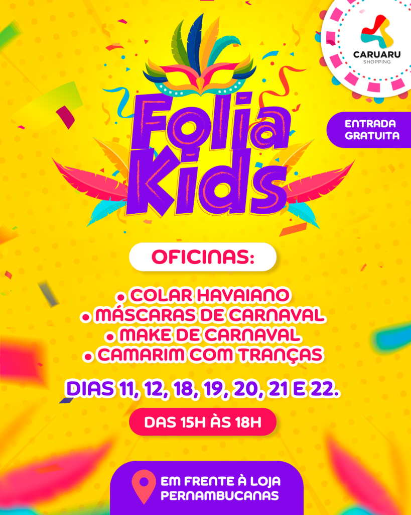 Folia Kids fará a alegria da meninada no Caruaru Shopping O espaço Folia Kids promete muita alegria e diversão para a meninada que visitar o Caruaru Shopping nos dias 11, 12, 18, 19, 20 e 21 de fevereiro. O evento será realizado em frente à loja Pernambucanas, das 15h às 18h. No espaço haverá oficinas […]