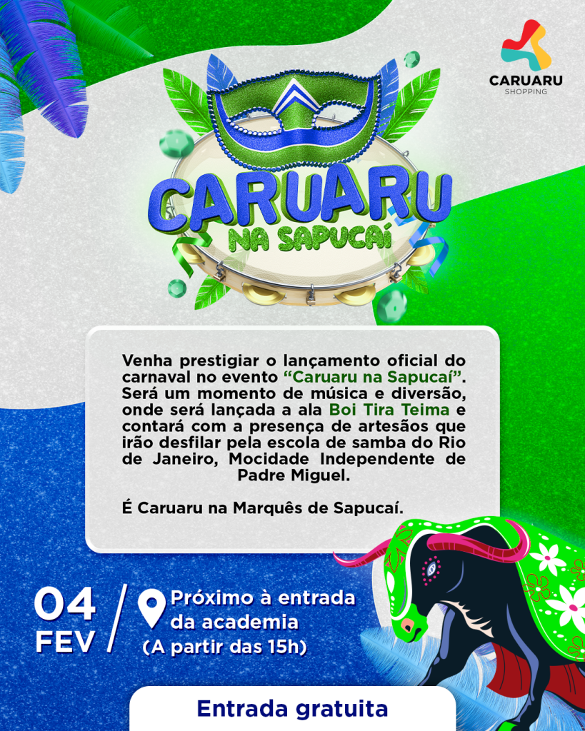 Caruaru Shopping faz lançamento oficial do carnaval “Caruaru na Sapucaí” O Caruaru Shopping fará, no dia 4 de fevereiro, o lançamento oficial do carnaval “Caruaru na Sapucaí”. O evento acontecerá às 15h, próximo à entrada da academia. Na ocasião, também será lançada as agremiações que irão desfilar na Marquês de Sapucaí, no sambódromo do Rio […]