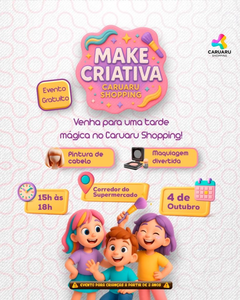 Make Criativa no Caruaru Shopping No dia 04 de outubro, o Caruaru Shopping realiza o evento infantil “Make Criativa”, no corredor do supermercado. A atividade acontece das 15h às 18h e promete uma tarde repleta de cores, imaginação e muita diversão para as crianças. Durante a oficina, os pequenos poderão explorar penteados com cabelos coloridos […]