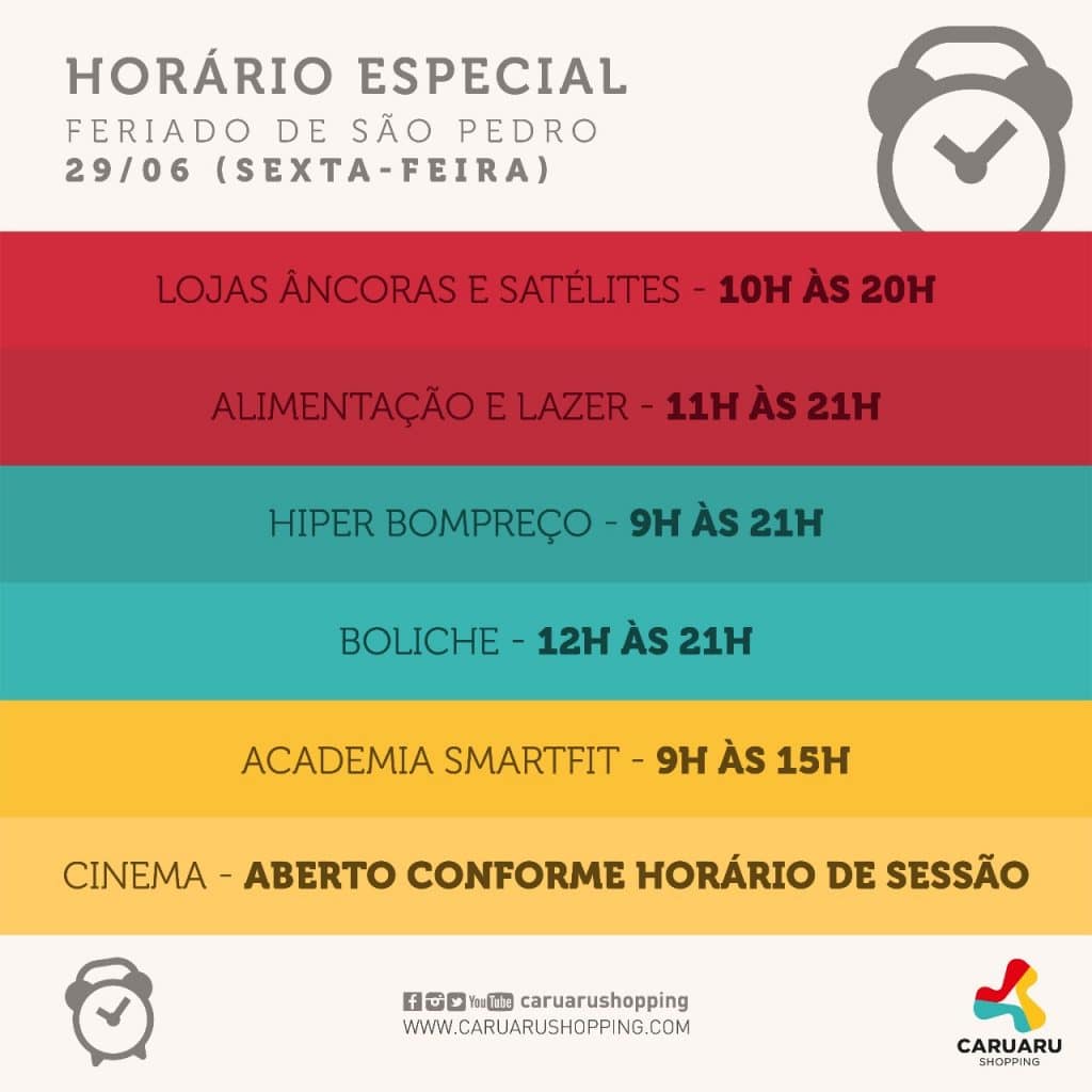 Na próxima sexta-feira (29/06), feriado de São Pedro, o Caruaru Shopping estará funcionando em horário especial. Confere o funcionamento das nossas operações, se programa e vem curtir a sexta-feira de folga com a gente!