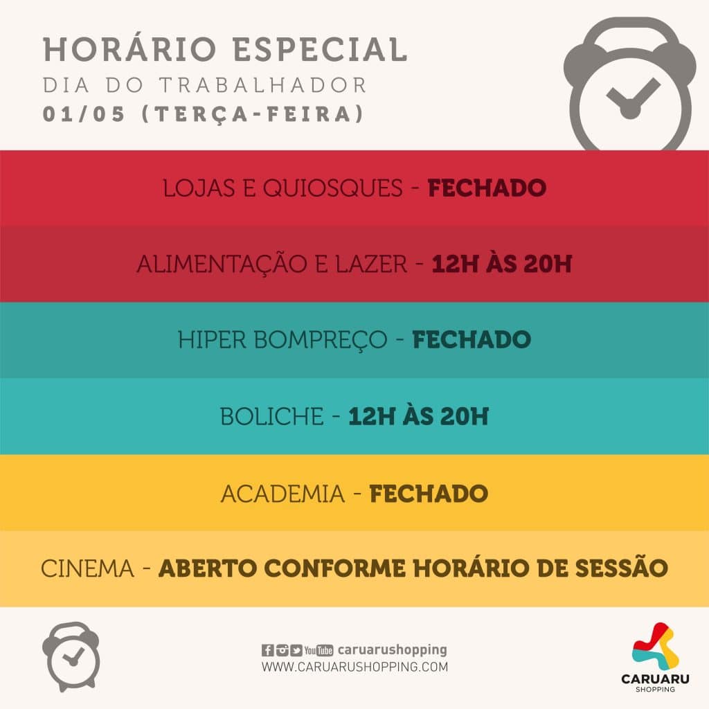 Nesta próxima terça-feira, dia 1º de maio, Feriado do Dia do Trabalhador, o Caruaru Shopping estará funcionando em horário especial. As lojas, quiosques e academia estarão fechados. As operações de alimentação e lazer funcionam das 12h às 20h e o Cinema funciona conforme horário de sessão. Se programa e vem se divertir com a gente!
